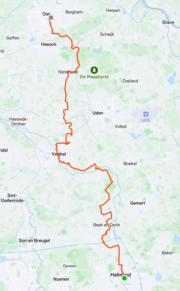 Strava-rit op 09 12 25 van Helmond naar Oss (58 km / +9 postcodes)